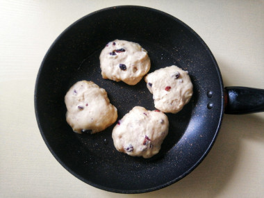 Закрыв кастрюльку с тестом крышкой, поместила ее в тёплую духовку. Тесто там хорошо поднялось, увеличившись в два раза. Добавив в тесто промытый изюм и перемешав всё ложкой, выкладывала тесто на сковороду, обжаривала до золотистой корочки. Получилось отлично!