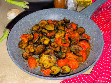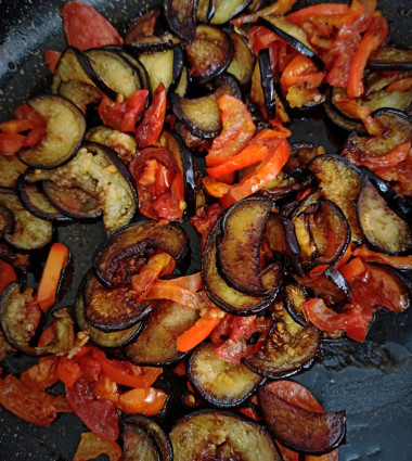 Добавьте к помидорам обжаренные баклажаны, посолите, поперчите по вкусу, снова перемешайте. Огонь на плите убавьте до чуть ниже среднего и тушите овощи от 5 до 10 минут. Иногда перемешивайте, чтоб ничего не подгорело, делайте это аккуратно, чтобы максимально сохранить кусочки целыми и не превратить блюдо в кашу.
