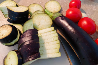 Баклажаны помойте в чистой воде, обсушите кухонным полотенцем. Срежьте "хвостики" с двух сторон и нарежьте синенькие кружочками толщиной около 0,5-0,8 мм. Если у вас баклажаны большие и толстые, то каждый кружочек разрежьте пополам или на четыре части.