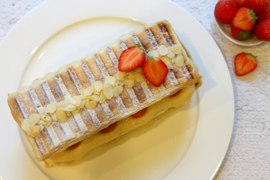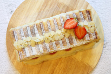 Размороженное слоёное тесто раскатайте в пласт толщиной не более двух миллиметров и разрежьте на три полосы по длине. Правильный мильфей состоит именно из трех слоев теста.