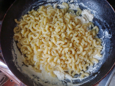 Макароны тем временем уже дошли до состояния аль денте — это когда они как-будто чуть недоваренные. Переложите макароны прямо из кастрюли в сковороду, не используя дуршлаг. Можете делать это щипцами или специальной ложкой для макарон.