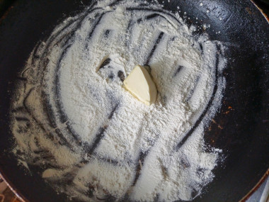 На другую конфорку поставьте сковороду и разогрейте ее. Всыпьте на горячую сухую сковороду муку и, постоянно помешивая, доведите ее до кремового цвета. О том, как выбрать сковороду читайте в статье, ссылка под шагами.