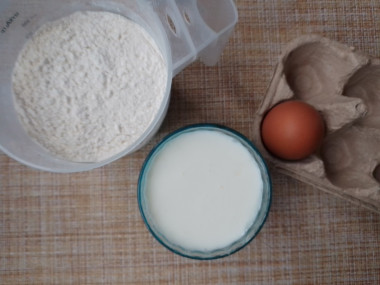 Как сделать тесто для пирожков на кефире на сковороде? Приготовьте ингредиенты по списку. Поскольку тесто на кефире готовится очень быстро, к моменту его замеса, начинка для пирожков должна быть уже готова. В глубокую миску влейте кефир комнатной температуры, жирность кефира можно использовать по своему усмотрению, чем жирнее будет кефир, тем пирожки будут более сдобными.