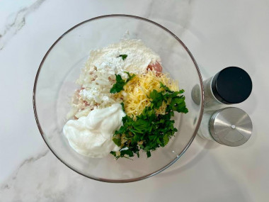 Всыпьте пару ложек крахмала и влейте кефир (можно заменить сметаной). По вкусу добавьте соль и специи. В зависимости от сыра соли может понадобиться больше или меньше, так как сыр бывает достаточно соленый. Учитывайте это при готовке.