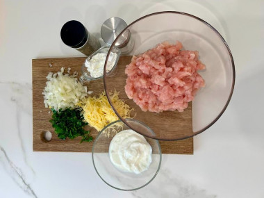 Я решила приготовить котлеты из куриного филе с сыром, следуя этому замечательному рецепту. Все необходимые ингредиенты были у меня под рукой, за исключением кефира и укропа, которые я заменила сметаной и петрушкой, так как их не оказалось дома.