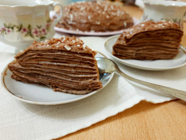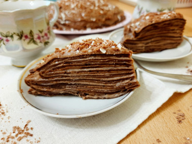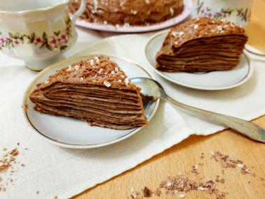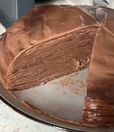 Дочь с тоской в глазах сказала, что до масленицы далеко, а блинный тортик хочется сейчас. Манипуляция удалась) Ну как тут не порадовать ребенка, тем более такой тортик не так уж долго делать. К приходу дочки из детского сада торт был готов) Выбрала шоколадный вариант, мы с ней любительницы шоколада. Тесто замесила быстро, молока мне тоже не хватило, добавила примерно 100-150 мл. Пекла на большой сковороде диаметром 26 см. Вышло девять блинов. Крем мой любимый заварной, очень порадовало, что в него добавляется шоколад. Пока не попробовала добавлять в крем и тесто шоколад вместо какао, думала, что никакой разницы нет. А вот и есть! Шоколад придает очень нежный и приятный вкус и консистенцию. Поэтому тем, кто будет повторять рецепт, не советую заменять шоколад на какао) В креме одну ложку муки заменила на кукурузный крахмал, получилось хорошо. Шоколадный крем получился очень вкусным и нежным! Торт собрала быстро, сверху потерла пару долек шоколада. Три часа мой тортик не успел простоять в холодильнике) Но он был точно не сухой, блинчики хорошо склеились кремом и кусочки торта отлично держали форму. Торт просто волшебный, очень вкусный, нежный, а главное шоколадный! Всем рекомендую приготовить, это не так трудно как кажется)