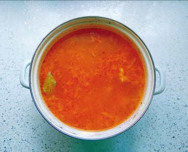 Добавьте в суп тушеную морковь и помидоры. Варите еще около 4 минут.