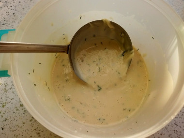 Добавьте в блинное тесто тертый сыр, измельченную зелень и растительное масло.