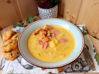 Нам с дочкой захотелось сырного супа с копчеными сосисками. Хорошо, что этот суп готовится очень быстро, а то мы были уже голодные) Сосиски у меня были говяжьи, копченых не оказалось, но очень ароматные. Сырки взяла мягкие, чтобы точно расплавились. Картошку и сырки начала варить вместе, картошка как раз успела развариться. Зажарка тоже готовится быстро, а добавленные во время обжаривания сосиски придали супчику аппетитный аромат. Суп очень вкусный! Он легкий и привлекательный на вид. Сыр полностью растворился и бульон стал однородный, без комочков сыра. При подаче дополнила суп сухариками со вкусом сыра. А дочка просто хлеб покрошила в тарелку) Мы довольны, спасибо)
