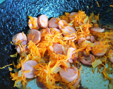 Сосиски добавляем в зажарку, перемешиваем, пусть они слегка обжарятся.