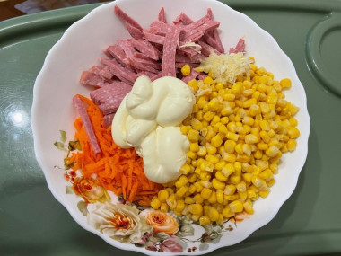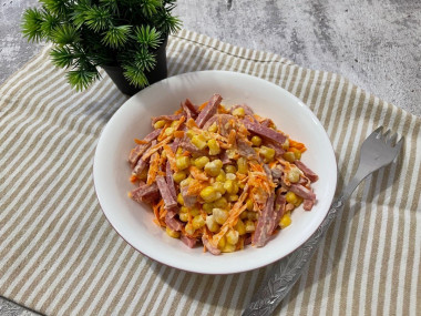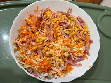 Салат с такими ингредиентами я готовила впервые. Чаще всего в семейном меню салаты либо с большим количеством ингредиентов (слоёные, например), либо повседневные простые, с двумя или тремя ингредиентами. Салат по этому рецепту мне понравился, он сочный, вкусный, сытный. Салат из моркови с чесноком очень часто на нашем столе, а этот салат можно назвать его вариацией. Кукуруза добавляет сочности, колбаса пикантности и вкуса. А всё вместе получается ярко и питательно.