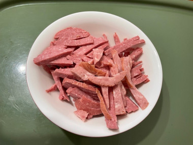 Копчённую колбасу извлеките из упаковки, снимите плёнку и порежьте брусочками. Добавьте в салатник к моркови.