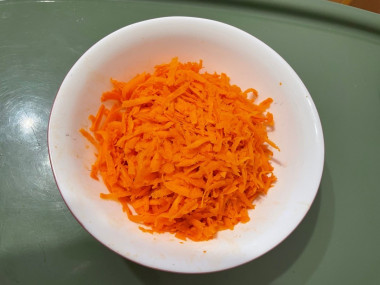 Свежие спелые плоды морковь промойте под проточной водой и очистите. Натрите морковь на крупной тёрке. В выбранную посуду для салата выложите измельчённую морковь.
