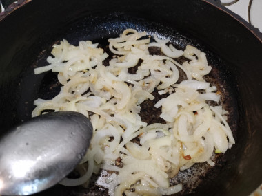 Для жарки разогрейте сковороду до горячего состояния и налейте немного растительного масла. Выложите нарезанный лук и обжаривайте его 1-2 минуты на небольшом огне до прозрачного состояния.