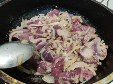 Затем выложите в сковороду подготовленную куриную печень. Перемешайте её с луком и готовьте минут 9-10, периодически помешивая. Куриная печень готовится очень быстро. Не пересушите её.