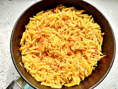 Рецепт этих макарон из серии "быстро и очень вкусно". Макаронные изделия не нужно предварительно отваривать, готовится всё в одной посуде- глубокой сковороде.