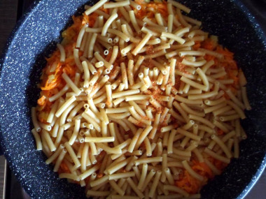 В сковороду с обжаренными овощами добавьте макаронные изделия. Посыпьте сверху специями и посолите. Налейте кипяток, тщательно всё перемешайте, дождитесь, когда вода закипит снова, убавьте огонь до среднего и томите под закрытой крышкой около пяти минут. Как выбрать макароны читайте в статье в конце рецепта.