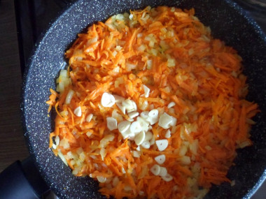 Морковку измельчите на средней тёрке. Чеснок пропустите через пресс или нарубите мелко ножом, это по желанию.