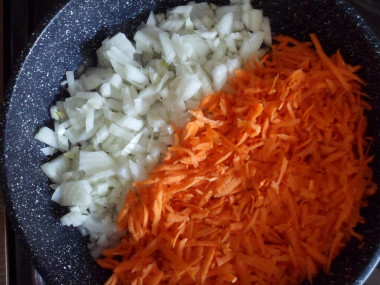 В сковороде разогрейте растительное и сливочное масло, отправьте туда лук, морковь и чеснок. Постоянно помешивая, обжарьте до того момента, пока все овощи не станут золотистого цвета. На это уйдёт примерно три-пять минут. Как выбрать сковороду и масло для жарки читайте в статьях в конце этого рецепта.