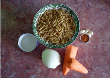Как сделать макароны с морковью и луком на сковороде? Подготовьте все необходимые ингредиенты. Лук и чеснок очистите от шелухи. Морковь вымойте в проточной воде с щеткой и очистите.