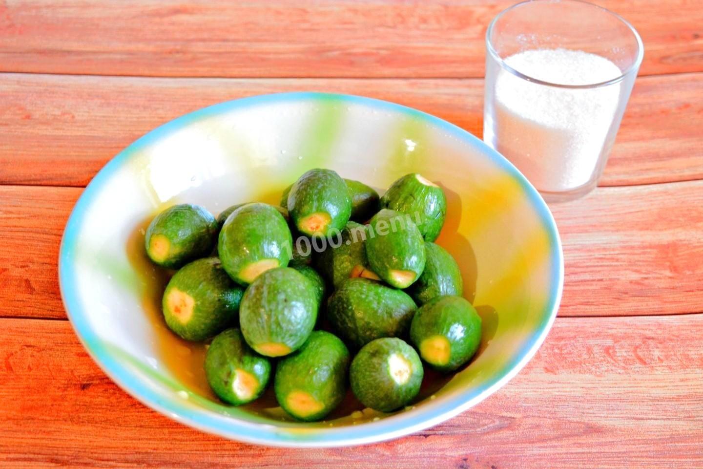 Подготовьте все необходимые ингредиенты. Берите спелые, но упругие плоды фейхоа без темных пятен, вмятин и признаков гниения. Кожица должна быть зеленой и матовой. Спелая фейхоа пахнет ананасом и клубникой.