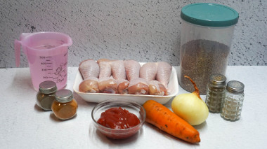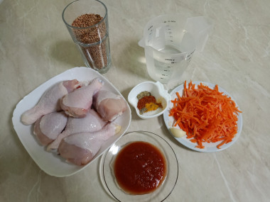 Как сделать гречку с курицей в духовке? Подготовьте необходимые ингредиенты. Для этого блюда можно брать куриные голени либо другие части курицы по вкусу. Если томатная паста очень соленая, то берите её меньше, чтобы не пересолить всё блюдо. Томатную пасту можно заменить кетчупом. Заранее включите духовку на 180 градусов.