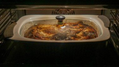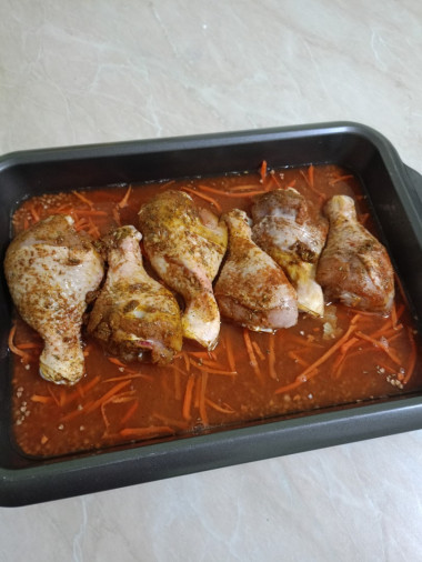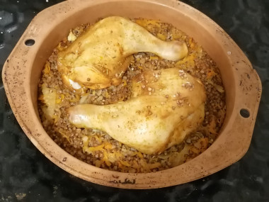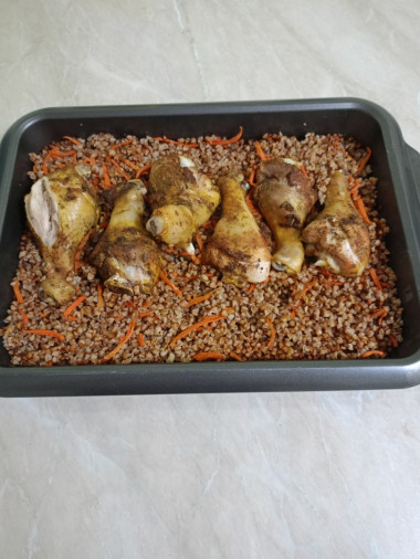 Давно не ела гречку, решила приготовить с ней что-нибудь на ужин. Вместо ножек использовала окорочка, а в качестве приправ брала тимьян, розмарин, паприку, чёрный перец и соль. Запах на кухне стоял прекрасный! Днем у меня были дела, поэтому я поставила замаринованное мясо в холодильник до того, как окажусь свободна. Очень удобно, ведь непосредственно на кухне мне нужно было быть только при жарке овощей. К моркови добавила небольшую луковицу. Духовку сперва разогрела до 200 градусов, а после того, как положила будущее блюдо в неё, убавила до 180. На запекание ушло чуть меньше часа. Очень вкусно и несложно, спасибо автору за рецепт