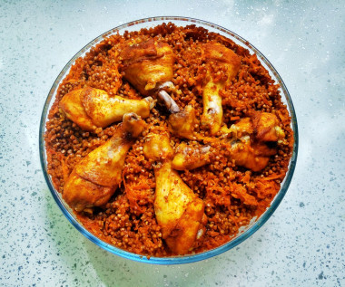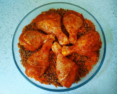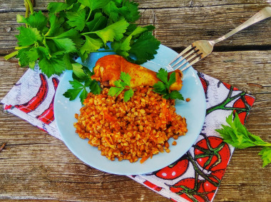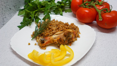 К ужину решила приготовить что-нибудь простое и питательное, выбрала - гречку с курицей в духовке. Подготовила необходимые ингредиенты, очистила лук и морковь. Голени у меня были маленькими, поэтому взяла большее количество - 11 штук, количество гречки брала из расчета 2 голени на 50 грамм сухой гречки. Голени промыла, обсушила и замариновала в специях. Лук нарезала кубиками и поставила обжариваться на сковороде, морковь потерла на крупной терке и добавила к луку. Немного обжарив овощи, сняла их с огня, и добавила промытую гречку. Далее в подготовленную форму для запекания выложила гречку с овощами, сверху выложила замаринованные в специях голени. Томатную пасту развела горячей водой и залила гречку с курицей. Количество воды для моего количества гречки рассчитала при помощи калькулятора на сайте. Форму для запекания закрыла крышкой и поставила в разогретую духовку. В моей духовке блюдо готовилось около часа. За это время гречка в духовке впитала в себя всю томатную воду, хорошо распарилась и стала мягкой, сочной и вкусной. Курочка хорошо пропеклась и стала очень нежной, мясо легко отходило от кости. Блюдо получилось очень вкусным и подойдет на любой случай, как для ужина, так и для встречи гостей! Спасибо автору за такой простой и вкусный рецепт!