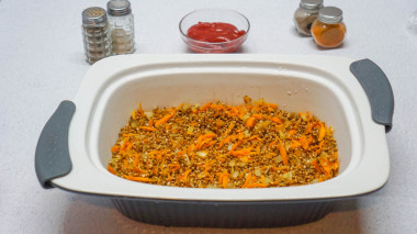 Переложите гречку с морковью в форму для запекания и разровняйте.