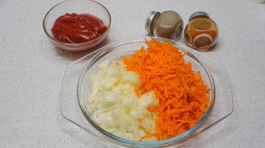 В сковороде разогрейте растительное масло и обжарьте на нём морковь в течение примерно 3 минут. При желании можно добавить луковицу. Ее нужно мелко порезать и обжарить в сковороде вместе с морковью до прозрачности Поставьте кипятиться воду. Для разведения томатной пасты (шаг 9) понадобится поллитра кипятка.