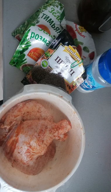 Куриные голени вымойте, обсушите и положите в ёмкость подходящего размера. Добавьте к курице пропущенный через пресс чеснок, куркуму, орегано, паприку, соль и перец.