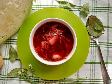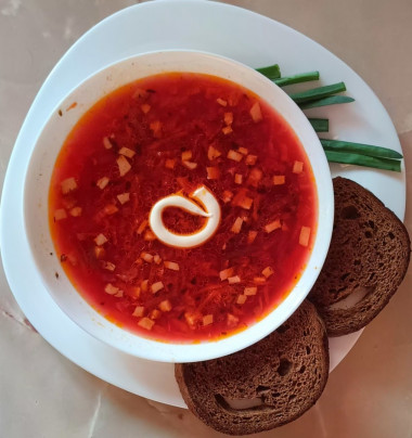 Наверное борщ это один из самых популярных супов. Существует множество вариаций и способов приготовления данного супа. Данный рецепт, можно сказать, это неотъемлемая база при приготовлении борща. Если придерживаться рецепта то мы получаем умеренно насыщенный с класическо свекольнльно-овощным вкусом борщ. Большенству супов как и к борщу отлично подходит лёгкая пикантность от любого острого соуса. Долька лимона как усилитель вкуса и наваристость с воздушным оттеноком лёгкой капченности, благодаря добавлению мелконареззаного подкапченого сала, что в совокупности делают из обычного борща, суп с очень мощным, многоступенчатым и всеобъемлющим вкусом, в каждой ложке которого можно почувствовать вкусовую экспансию и легкую, обволакивающую как облако горманичьность вкусов и ароматов.