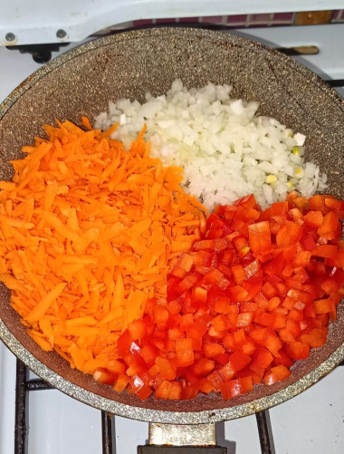 На сковороде разогрейте растительное масло и выложите нарезанные лук, морковь и болгарский перец. Обжаривайте овощи на небольшом огне, помешивая, около 5 минут. Ориентируйтесь на свою плиту.