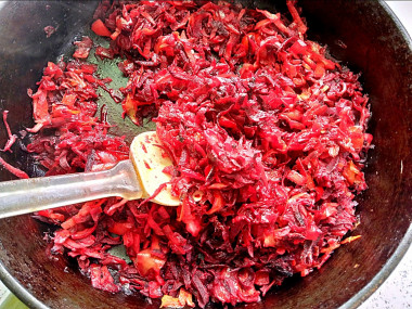 Добавьте к овощам на сковороде тертую свеклу. Перемешайте. Я всегда кладу немного сахара в зажарку, но это дело вкуса. Добавьте к овощам томатную пасту. Хорошо перемешайте. Если у вас томатная паста очень густая, влейте на сковороду немного воды. Хватит нескольких столовых ложек.