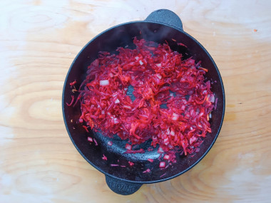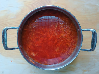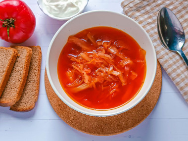 Постный борщ по этому рецепту получился просто великолепным! Действительно, даже при отсутствии мяса, суп очень насыщенный. Думаю, это получается за счёт вкусной поджарки. Овощи на сковороде довела до полной готовности, чтобы при добавлении в бульон больше их не варить. У меня была молодая капуста, поэтому сначала я заложила в кастрюлю картошку. Вместо томатной пасты у меня кетчуп. Я тоже всегда кладу в борщ ложечку сахара, он замечательно оттеняет вкус. В общем борщ получился вкусным, питательным, красивым. Спасибо за рецепт.
