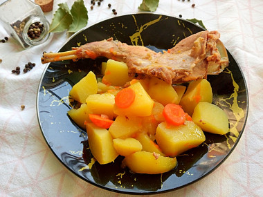 Отличное блюдо Кролик в казане тушеный с картошкой! Очень люблю мясо кролика в любом виде. У меня в наличии была целая тушка крупного кролика, решила всю ее и потушить. В мой казанок все это богатство не влезло бы, поэтому воспользовалась широкой кастрюлей, в ней удобно перемешивать кусочки мяса и картошки. В рецепте заинтересовало то, что используется поджарка из моркови и лука, а также добавляется морковь ломтиками. Поджарка сделала блюдо нежным, сытным, насыщенным овощными соками. Тушила мясо 1,5 часа. За это время оно стало невероятно мягким, тающим, буквально распадается на волокна. Затем уже добавила картошку с морковкой и тушила до готовности. Томат не стала добавлять, не хотелось кислой нотки) Получилось изумительное блюдо, сытное и очень вкусное. Моя свекровь называет это "соусом" из-за большого количества подливки. А подливка получилась прекрасная, я ее вместо супа ела) Специи тоже не стала добавлять, мне понравился этот "натуральный" вкус! Очень рекомендую воспользоваться этим рецептом, если вдруг в морозилке есть тушка кролика)