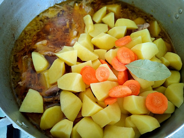 По истечение 40 минут кролик должен быть уже мягкий и почти готовый. Добавьте в казан картошку с морковью и долейте кипяток, чтобы он полностью всё покрыл почти до верха картошки. Тушите кролика с овощами еще 10-15 минут до готовности картошки и морковки.