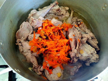 Готовые лук и морковь добавьте к кролику.