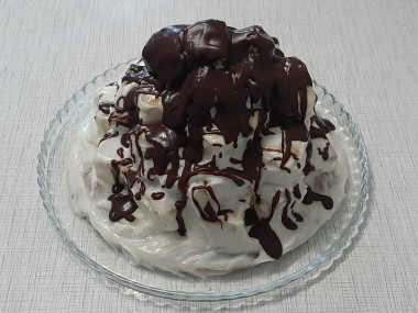 Окунайте шоколадные кусочки поочередно в крем и укладывайте их на белый корж горкой. У меня поместились не все кусочки, поэтому я и давала совет, что белый корж должен быть по размеру больше шоколадного.
