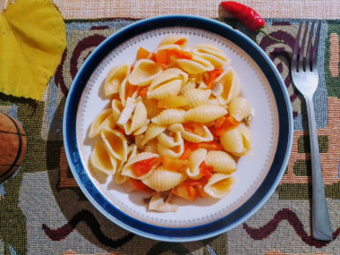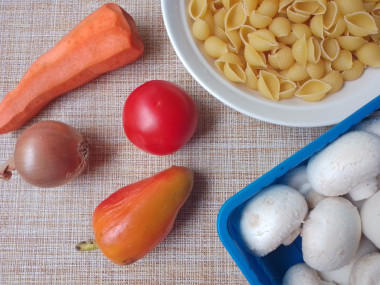 У меня были свежие шампиньоны - их и взяла. Готовила по рецепту. Сначала обжаривала овощи, а уж потом добавляла макароны.