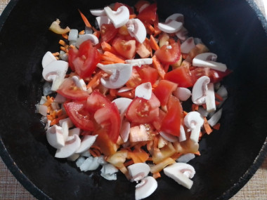 Отправляем в сковороду с морковкой и репчатым луком болгарский перец, помидоры и грибы, перемешиваем, продолжаем их жарить вместе на среднем огне в течение 10 минут.