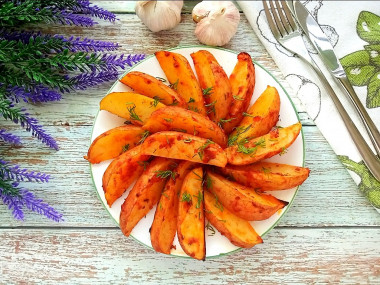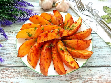 Захотелось мне печёной картошки. Рецепт "молодая картошка в кожуре в духовке" пришелся мне по душе. Но так как сейчас не сезон, я использовала картошку не молодую. Вместо помидора взяла томатный кетчуп. Из специй выбрала приправу для картофеля и молотую сладкую паприку. Хорошо вымыла клубни картофеля, порезала на 4 части. Смешала всё для маринада. Тщательно обмакнула дольки картошки в маринад. Выложила на деко и сбрызнула маслом, чтоб картошка не подсыхала. Готовила 25 минут под фольгой и 20 минут без фольги.
