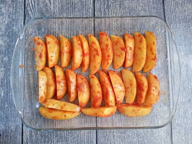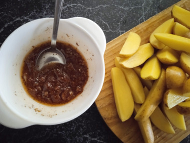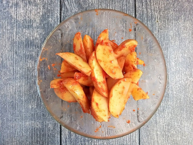 Обмакните каждую дольку картошки в томатном соусе. Или для удобства можно картофель выложить в целлофановый мешочек, добавить томатный соус, а затем перемешайте всё в пакетике, переминая его с одной руки на другую. Оставлять мариноваться картофель не следует, готовить нужно сразу.
