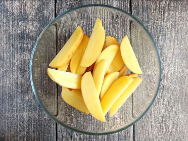 Картошку хорошо промыла щеточкой, чтобы точно никакой грязи не осталось. Люблю картошку с кожурой, тем более в ней много полезного. Клубни старалась разрезать на одинаковые дольки.