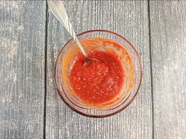 Добавьте к помидору щепотку соли, оливковое масло, сушёный базилик или орегано, немного молотых перцев и сухой чеснок. Всё очень хорошо перемешайте. На данном этапе можно добавить любимые приправы и специи, их количество регулируйте на свой вкус. Соус готов.
