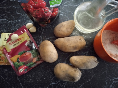 Для соуса взяла замороженные протертые помидоры. Добавила свежий чеснок, пропущенный через пресс, соль, перец, паприку, приправу для картофеля и сушеный розмарин. Мне очень нравится сочетание картошки с чесноком и розмарином). Аромат при запекании потрясающий!
