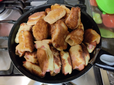 Сосиски в дрожжевом тесте на сковороде очень вкусные получились. Тесто купили готовое, всё видно на фото, залепили края и всё, больше ничего не добавляли, просто обжарили со всех сторон) Для перекуса или на тормозок самое то!