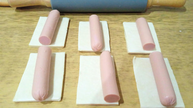 Закройте сосиску с каждой стороны тестом и покатайте между ладонями для уплотнения теста, чтобы получился пирожок. Таким же образом заверните в тесто остальные сосиски.