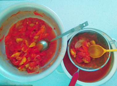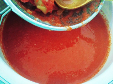 Сначала протрите овощи через обычный дуршлаг, удаляя кожицу и крупные семена. Затем возьмите сито. Чем мельче будет сито, тем лучше и нежнее по текстуре получится ваш кетчуп. Если вас не устраивает консистенция кетчупа, можете обработать его блендером до состояния пюре.
