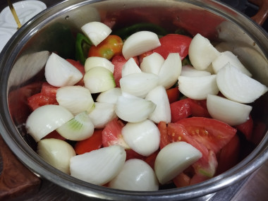 Из перца удалите семена и плодоножки. У помидор и лука удалите "попки". Помидоры, болгарский перец и репчатый лук нарежьте крупными кусками, можете на четвертинки. Для варки большого количества овощей возьмите широкую и глубокую кастрюлю. Переложите нарезанные овощи в кастрюлю, залейте водой. Воды наливайте столько, чтобы она полностью покрывала овощи. Подробнее о выборе кастрюли читайте по ссылке под шагами.